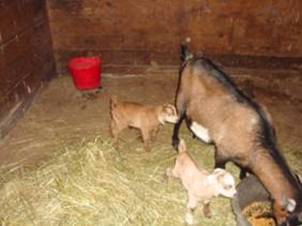 We raise goats for fun and to clean out the wooded lots. The little ones are the most fun. They are real good for the children and are fun to watch grow. Here are some new baby goats. Tinker Bell is the doe. These are boer cross goats which were born April 19, 2009. |